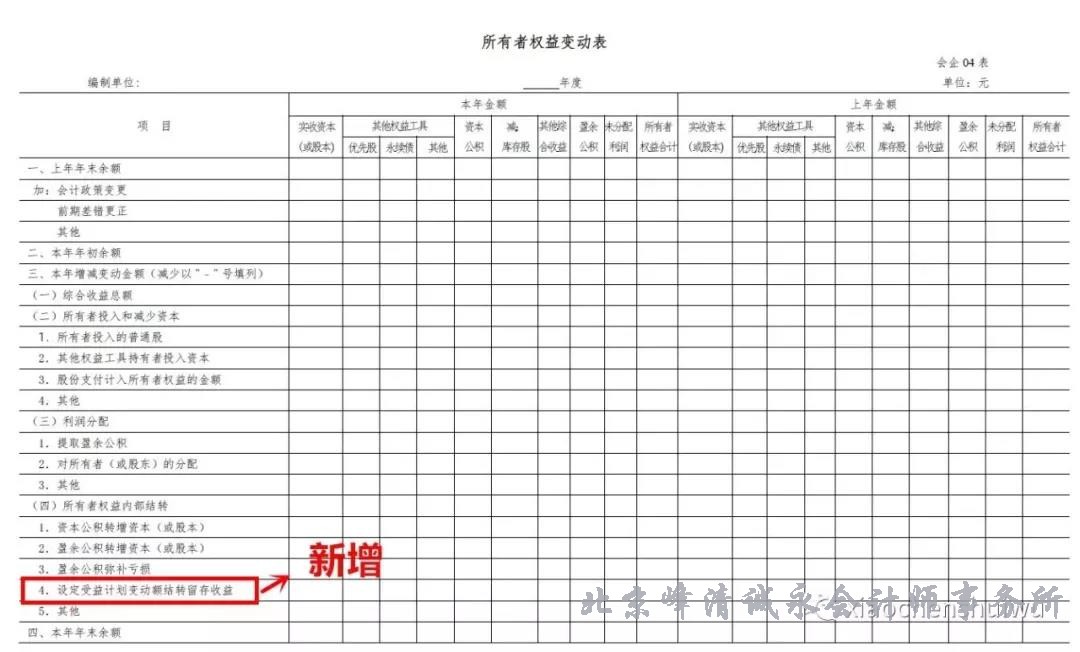 (三)所有者权益变动表主要落实《〈企业会计准则第9号——职工薪酬〉应用指南》对于在权益范围内转移“重新计量设定受益计划净负债或净资产所产生的变动”时增设项目的要求: