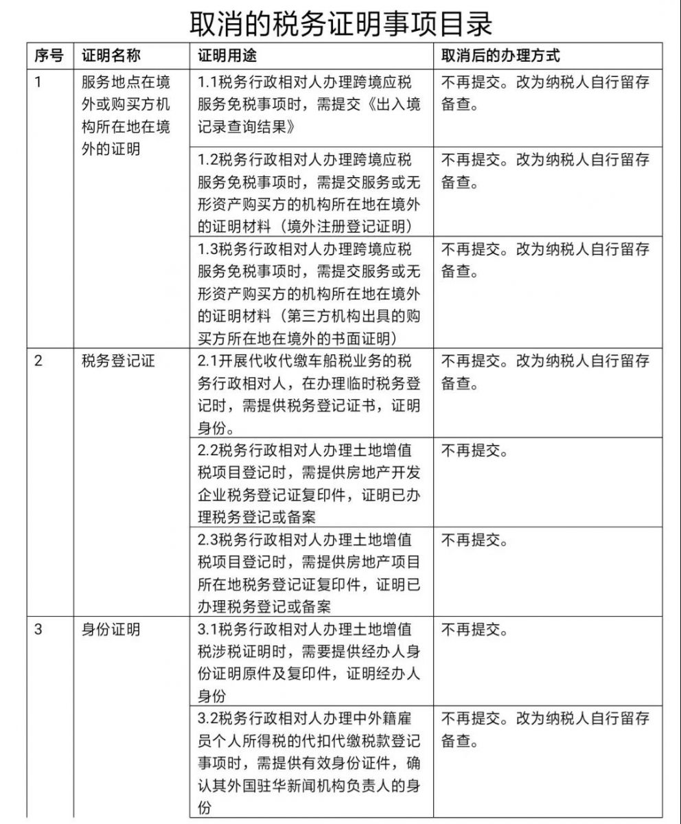 《公告》附件中列示的证明事项取消后,均不需要再提供相关材料,改为纳税人自行留存备查、加强后续管理等方式办理,每项证明事项的具体替代措施已在附件中列明。
