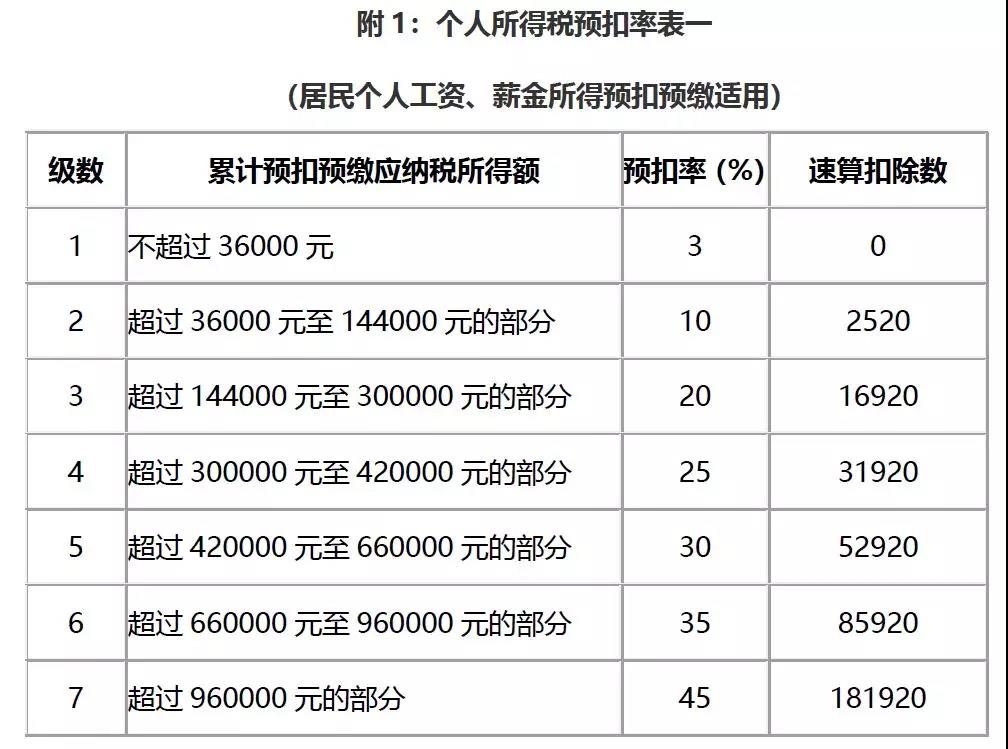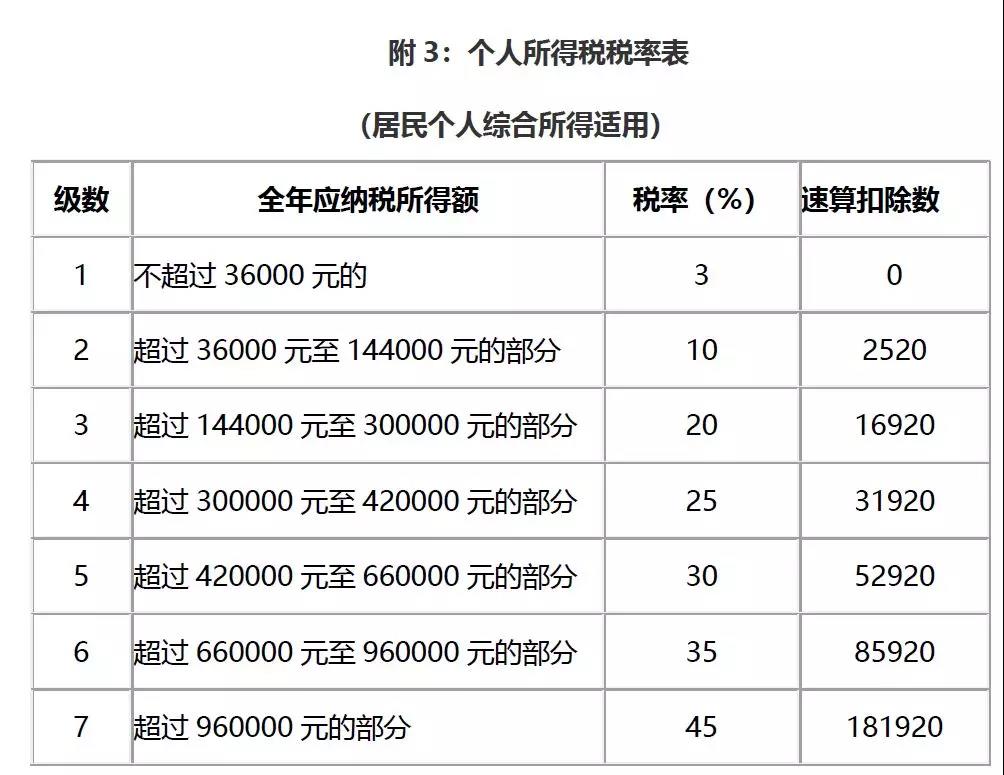 居民个人的综合所得,以每一纳税年度的收入额减除费用六万元以及专项扣除、专项附加扣除和依法确定的其他扣除后的余额,为应纳税所得额。适用百分之三至百分之四十五的超额累进税率,详见本文附3。