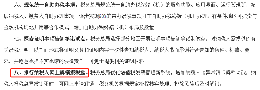 八、推行纳税人网上解锁报税盘。税务总局优化增值税发票管理新系统,增加纳税人端异常清卡解锁功能,纳税人报税盘异常锁死时,可网上申请解锁,税务机关根据规定流程核实处理,排除风险后及时解锁。