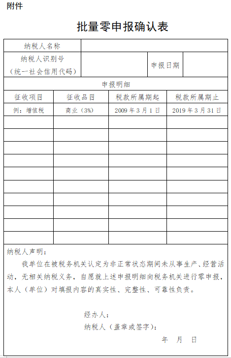 (一)处于非正常状态纳税人在办理税务注销前,需先解除非正常状态,补办纳税申报手续。符合以下情形的,税务机关可打印相应税种和相关附加的《批量零申报确认表》(见附件),经纳税人确认后,进行批量处理: