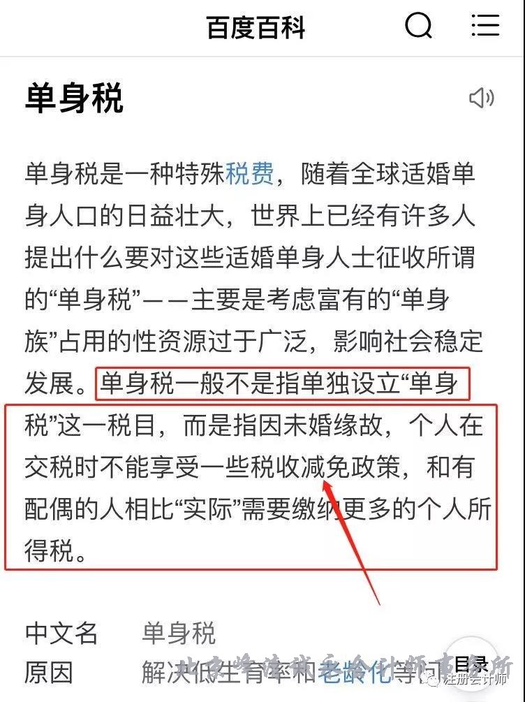 大家看完图片注意看下百度百科对策关键词:未婚缘故,不能享受税收政策,甚至要比有对象的人多缴个人所得税。