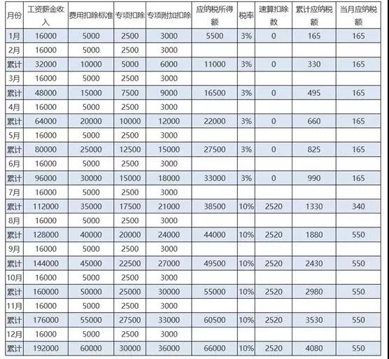 1月累计预扣预缴应纳税所得额=累计收入-累计免税收入-累计减除费用-累计专项扣除-累计专项附加扣除-累计依法确定的其他扣除=16000-5000-2500-3000=5500元,对应税率为3%。
