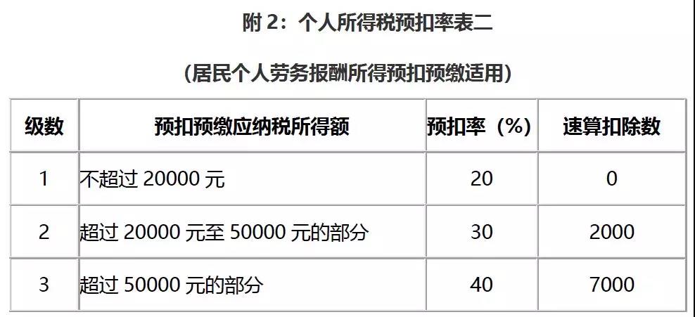 应纳税所得额:劳务报酬所得、稿酬所得、特许权使用费所得,以每次收入额为预扣预缴应纳税所得额,计算应预扣预缴税额。劳务报酬所得适用个人所得税预扣率表二,详见本文附2,稿酬所得、特许权使用费所得适用百分之二十的比例预扣率。