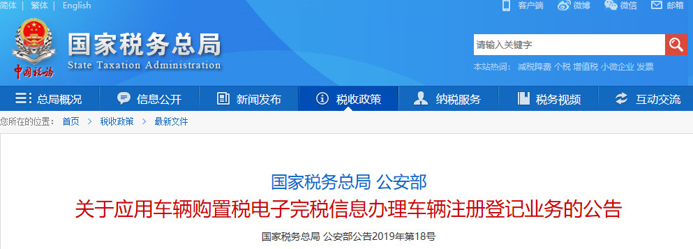 一、自2019年6月1日起,纳税人在全国范围内办理车辆购置税纳税业务时,税务机关不再打印和发放纸质车辆购置税完税证明。纳税人办理完成车辆购置税纳税业务后,在公安机关交通管理部门办理车辆注册登记时,不需向公安机关交通管理部门提交纸质车辆购置税完税证明。